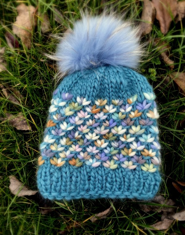 Popis na zimní čapku ze silné příze s vyplétaním kvítkovým vzorem.