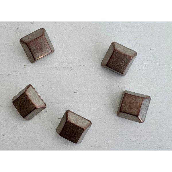 Knoflík z patinovaného kovu, čtvercový tvar.