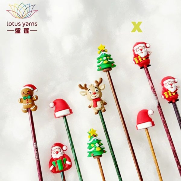 Sada 2 koncovek na jehlice s vánočním motivem Santy, který nese žlutý balíček..